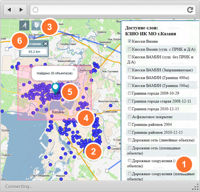 Включение слоев в списке, элемент дистанция и поиск по области